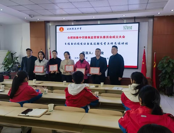 王俊校长给六位家长代表颁发荣誉聘书,给所有膳食委员会代表发放“合肥新康中学安全检查”袖章,并与大家合影留念。