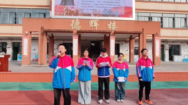 九(1)班的王宇馨、李博研、黄楷瑞、赵旭昊、李明权同学还带来了《勿忘国耻,振兴中华》诗朗诵。同学们用真挚而富有感染力的声音,诉说着历史不能被遗忘、国耻须时刻铭记于心,更呼吁着在场的每一个人要将这份悲愤化为振兴中华的实际行动,在新时代的征程中努力拼搏,勇往直前。