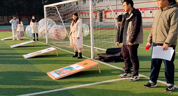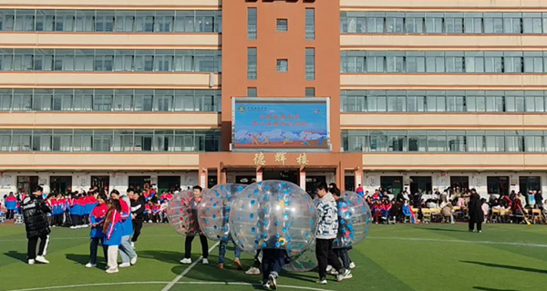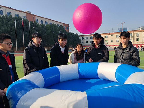 碰碰球:在操场上画好的大圈中,每个班级的一名同学穿着软球相互碰撞,看哪个同学们能坚持到最后。