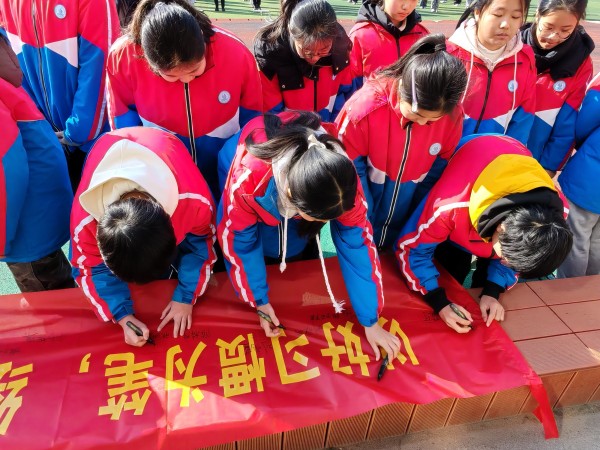 倡议完毕,七八年级两名班干部和九年级两名团员代表上台,在“文明礼仪,我先行”的横幅上签字留影。他们的举动不仅表达了自己对文明礼仪的支持,更激励着其他同学积极参与到文明行动中来,为校园文明贡献自己的力量。