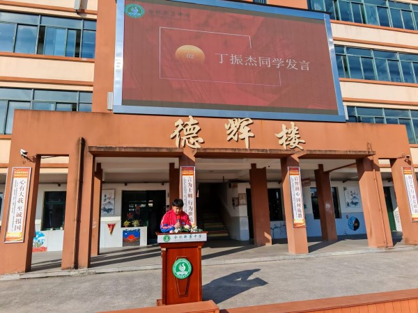 其次是学生代表九3班的丁振杰同学发言,首先他向辛勤耕耘、无私奉献的老师们致以最崇高的敬意,向在素质展示中取得优异成绩、获得表彰的同学们表示热烈的祝贺,其次分享他的学习方法与奋斗心得,让同学们从他的故事中汲取经验,找到属于自己的学习之道。
