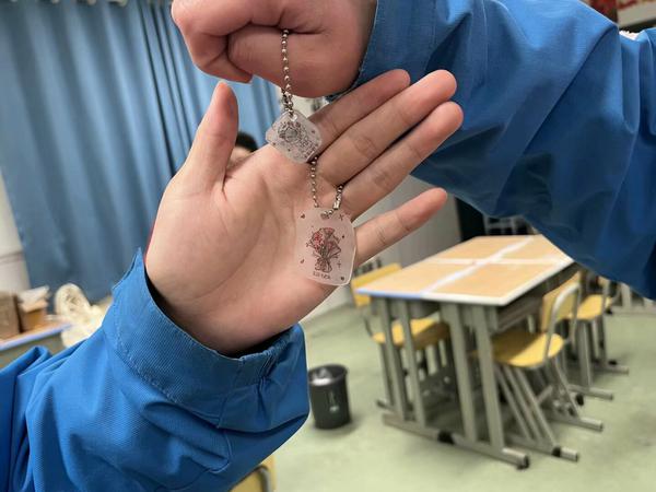 美术社团:首先,带领学生学习热缩片的基础知识;接着,设计并绘制花束图案于热缩片上;然后,加热使热缩片收缩成型;最后,穿链组装成精美挂饰,体验美术创作的乐趣。制作完成的作品同学们将其挂在了饭卡上或送给自己的家人朋友。