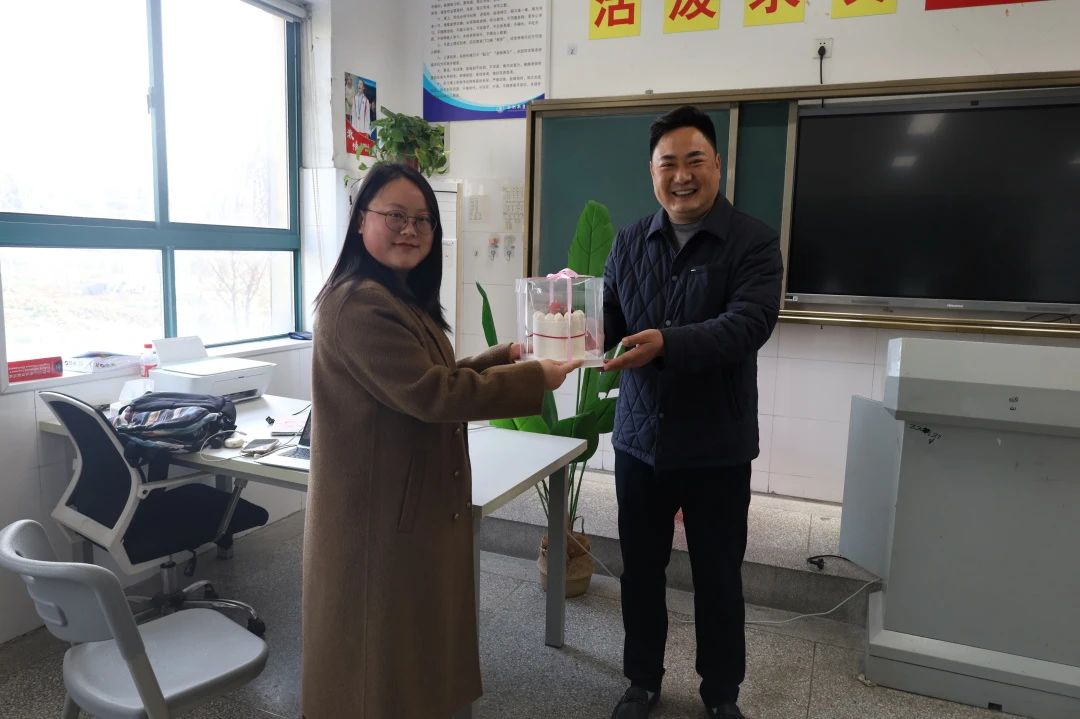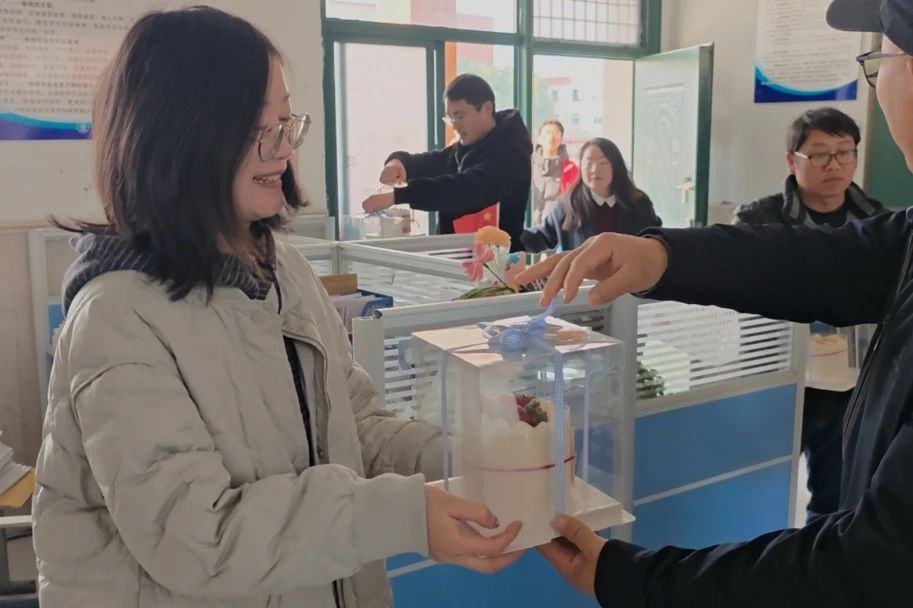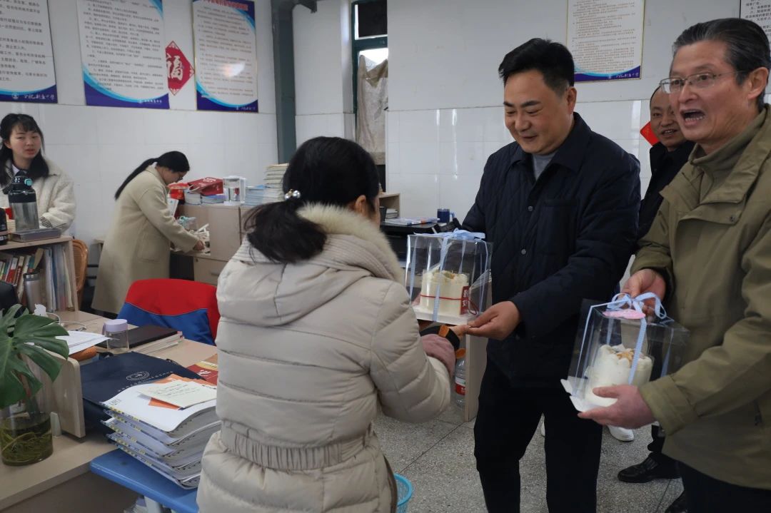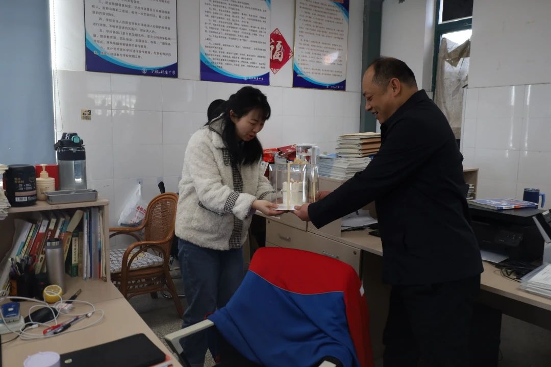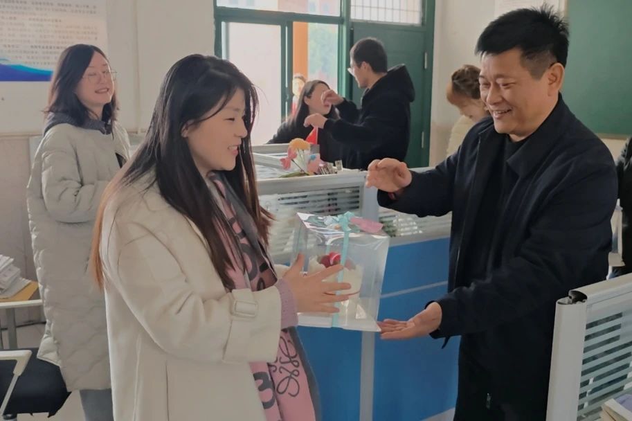 大课间时分,学校领导班子成员满怀热忱,分别前往初、高中部及行政后勤部。他们与女教职工们亲切握手、交谈,将一份份精心准备的节日礼物送到她们手中。每一份礼物都蕴含着学校对女教职工们深深的关怀,感谢她们在教育教学、后勤管理等各项工作中,以女性特有的细腻、智慧与坚韧,为学校的发展无私奉献,撑起了学校的“半边天”。女教职工们接过礼物,眼中闪烁着感动的光芒,欢声笑语回荡在校园的各个角落,让这个春日的校园充满了温情与爱意。