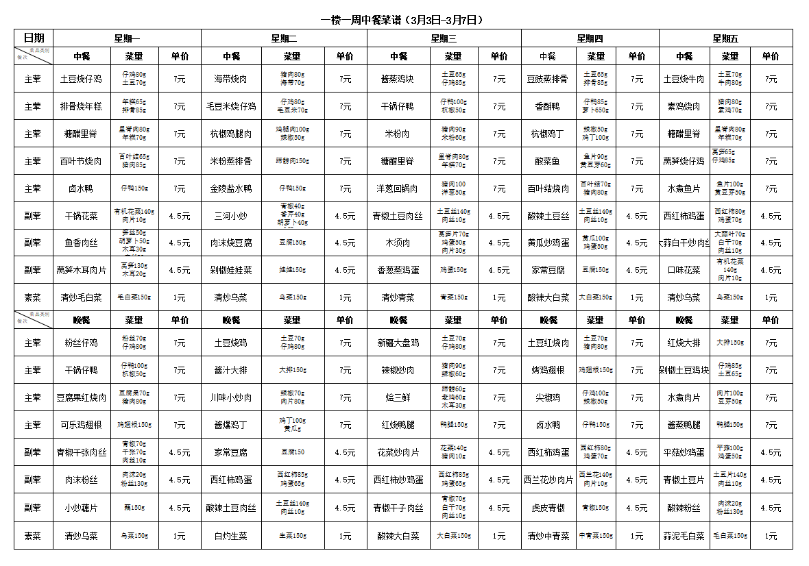 合肥新康中学食堂一周菜谱(3月3日-3月7日)