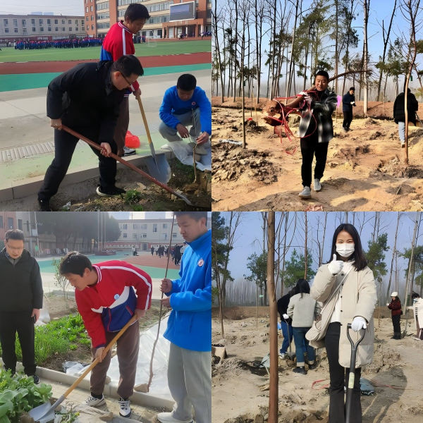 ●植树节——种下一棵树,收获一片绿3月10日下午,初中部组织开展植树活动。师生们热情高涨,拿着工具分工协作。现场一派热火朝天的景象,大家挥锹铲土、扶苗填坑、提水浇灌,种下十几棵桃树、李树、杏树。此次活动,不仅美化校园,还增强了师生的环保意识,让绿色理念在校园生根发芽 。