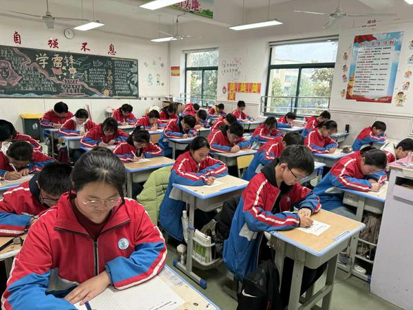 比赛分为英语和语文两个组别,内容分别选取初中教材中的经典段落。比赛现场,同学们满怀激情,用心书写每一个笔画、每一个单词和汉字。他们坐姿端正,握笔正确,充分展示出扎实的书写功底。英语书写中,字母的圆润流畅、单词间距的均匀把控;语文书写时,汉字的间架结构、笔画的粗细变化,都体现出同学们对书写的认真态度。