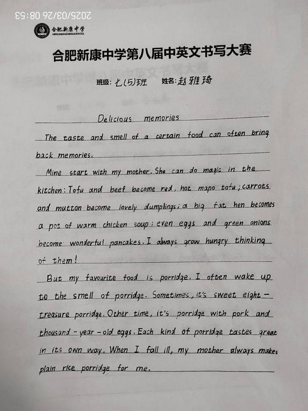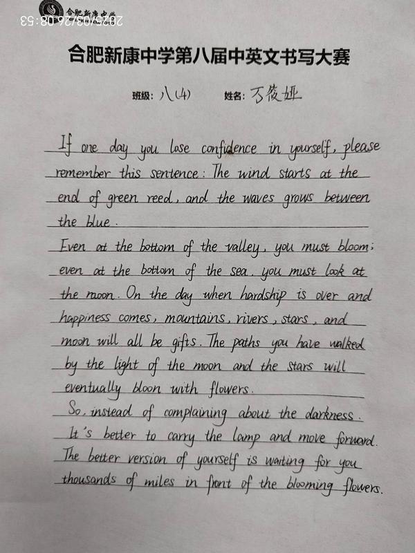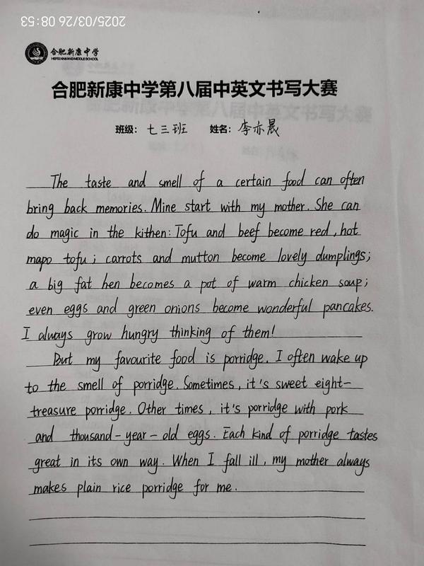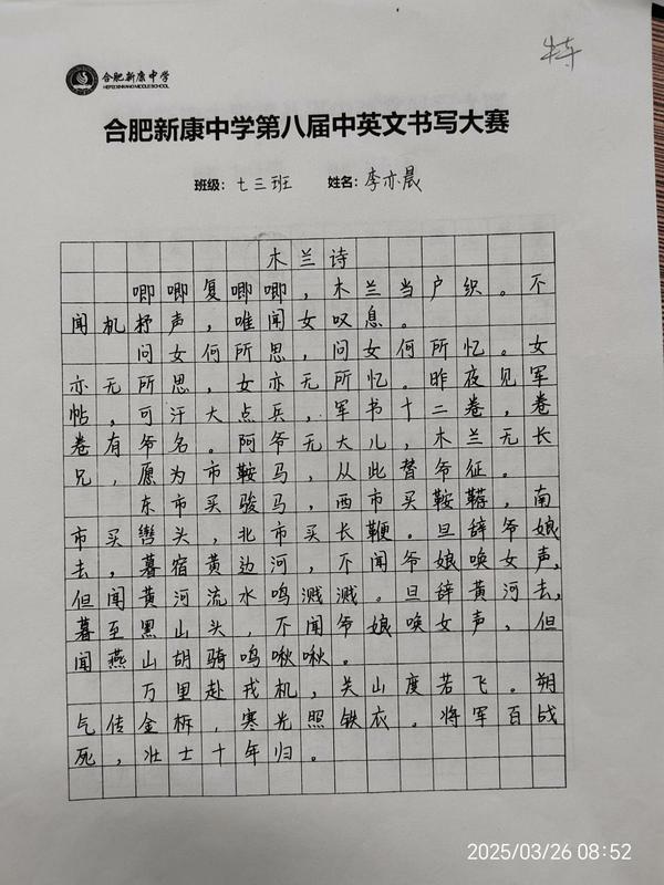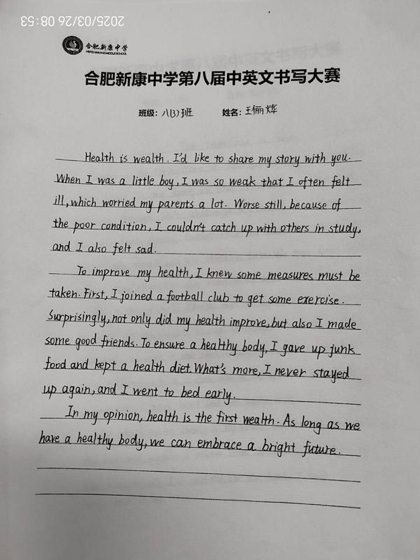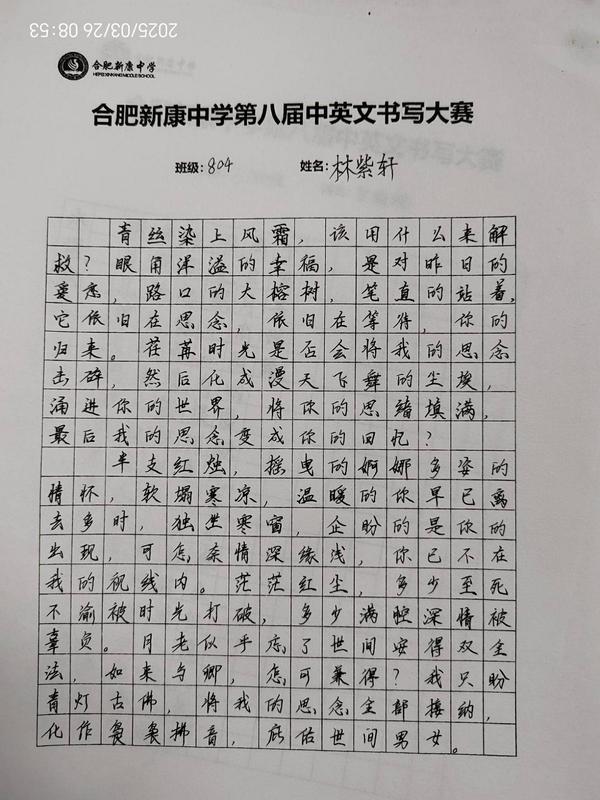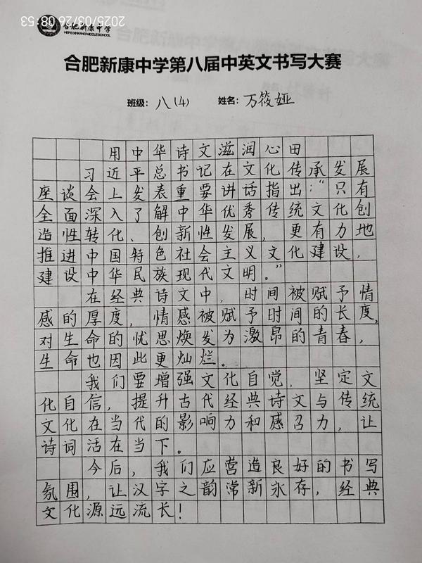 为传承中华优秀传统文化,提升学生英语和语文的书写水平,培养良好的书写习惯,合肥新康中学初中部于2025年3月16日举办了第八届中英文书写大赛。此次大赛面向全体初中学生,旨在以赛促练,激发学生对书写艺术的兴趣。