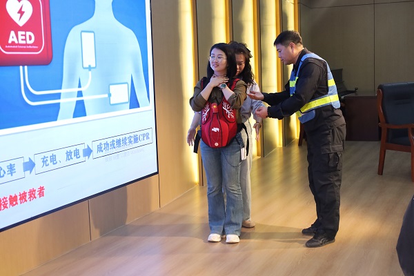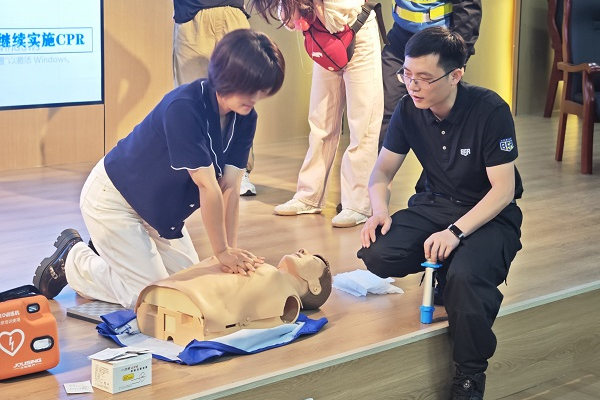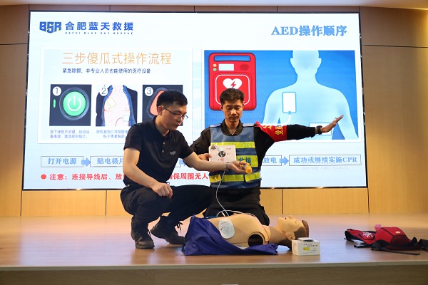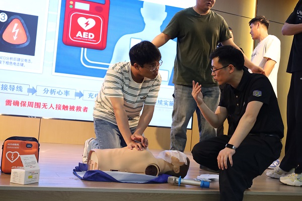 在心肺复苏(CPR+AED)环节,单老师系统讲解了心肺复苏(CPR)与自动体外除颤仪(AED)联动施救技术,通过人体模型分步骤演示胸外按压深度、频率及人工呼吸规范动作,强调"黄金四分钟"对挽救生命的关键作用。