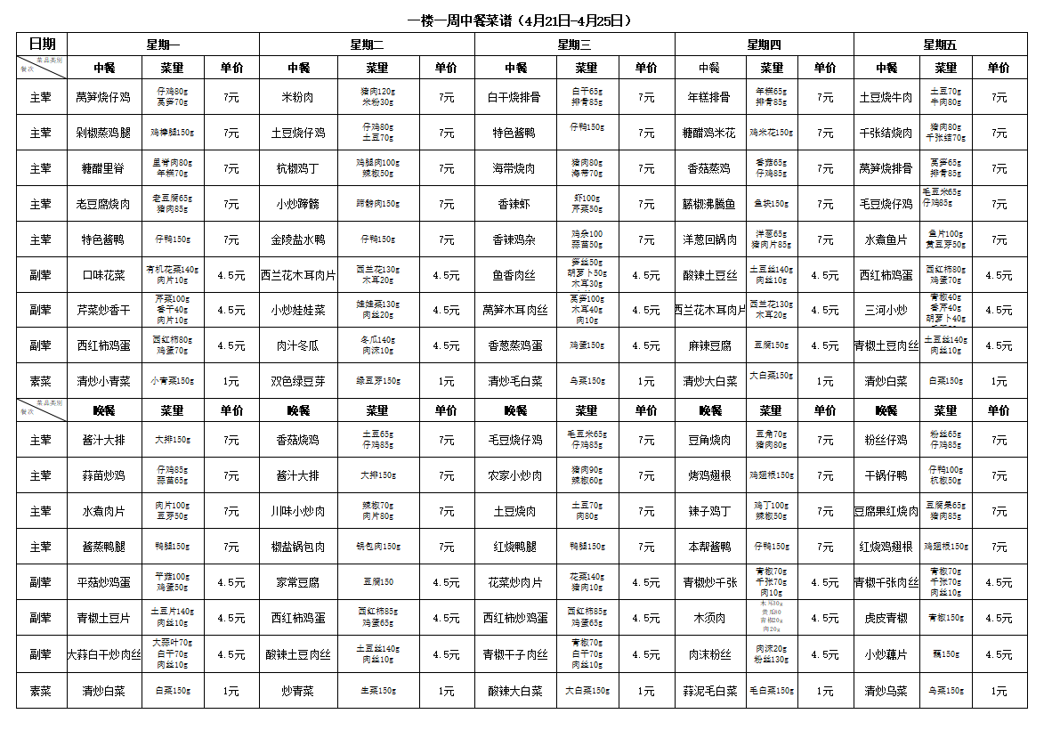 合肥新康中学食堂一周菜谱(4月21日-4月25日)