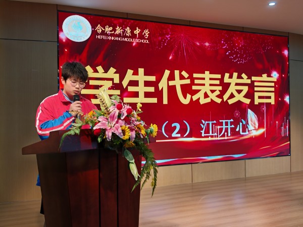 优秀学生代表八(2)班江开心同学以“勤学为舟,自律为楫”为主题,分享学习心得。他坦言:“每一份满分答卷背后,是错题本上反复订正的笔迹,是晨光中诵读的身影。”其真诚的讲述引发共鸣。