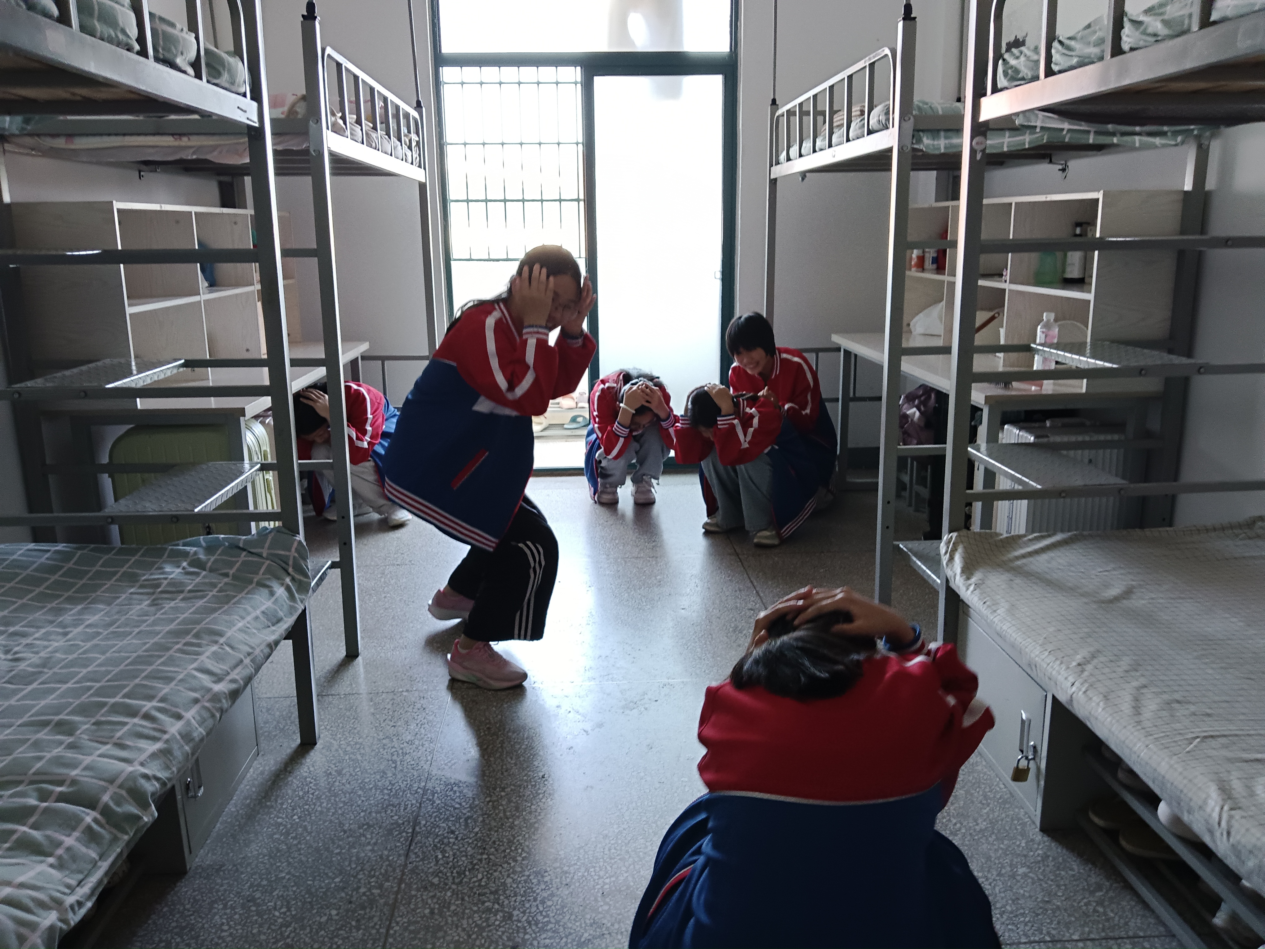 警报响起后,正在宿舍的学生们在生活老师引导下,第一时间就近寻找安全位置躲避,有的躲在床底下,有的蹲在墙角,尽量降低身体重心,用枕头、被褥护住头部,最大限度减少伤害风险。