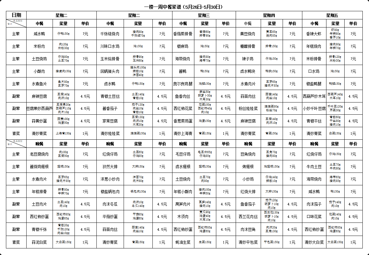 合肥新康中学食堂一周菜谱(5月26日-5月30日)