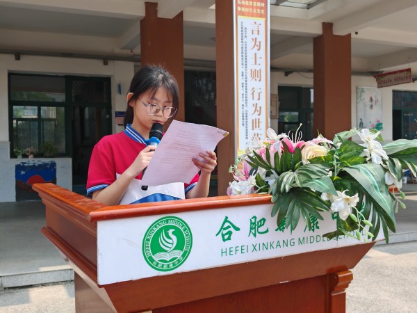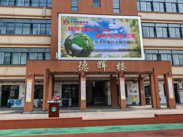 为弘扬绿色环保理念,增强师生环保意识。合肥新康中学初中部于5月26日上午举行了以“环保节能齐行动,绿色生活惠万家”为主题的升旗仪式。活动由八(4)班的林紫轩同学主持。