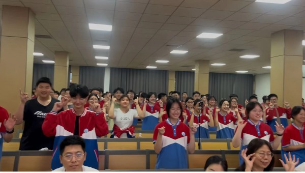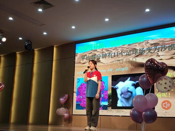 活动以一段诙谐的英文脱口秀视频拉开帷幕,随后播放的世界地球日环保公益纪录片段,配合震撼的生态画面,为现场注入强烈使命感。全体高一学生更以青春洋溢的《爱你》手势舞表演掀起首个高潮,整齐划一的动作与温暖笑容,既传递环保事业的热爱,也展现新时代青少年的蓬勃朝气。