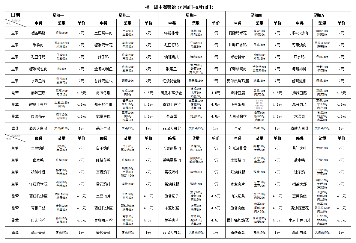 合肥新康中学食堂一周菜谱(6月9日-6月13日)