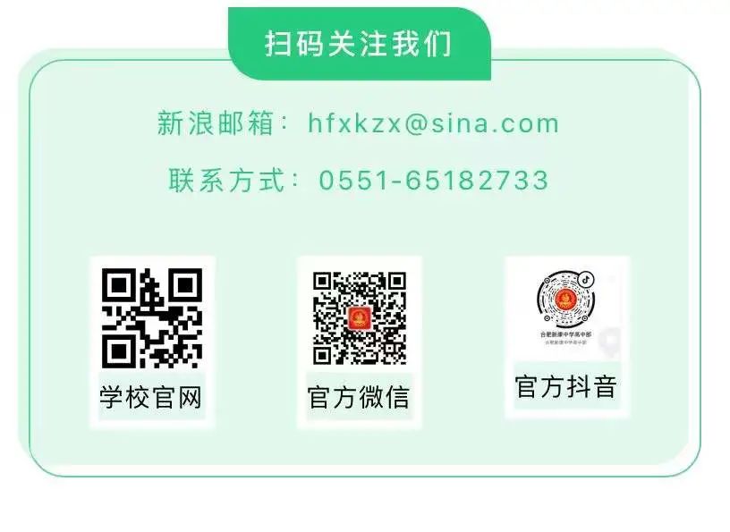 想了解更多学校资讯,请扫码关注合肥新康中学官方网站、官方微信公众号、官方抖音号。