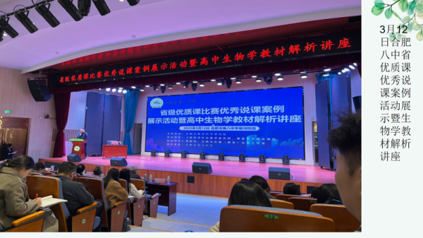 3月12日,我校高一生物组教师赴合肥八中参加省级优质课比赛优秀说课案例展示活动暨高中生物学教材解析专题讲座。在活动第一部分,教师们通过观摩获奖教师的精彩说课展示、聆听专家深度点评、参与现场互动研讨,深刻领略到教学名师的课堂艺术与创新理念,对说课的设计思路与实施策略有了更系统性的认识,为提升教学水平积累了宝贵的经验。