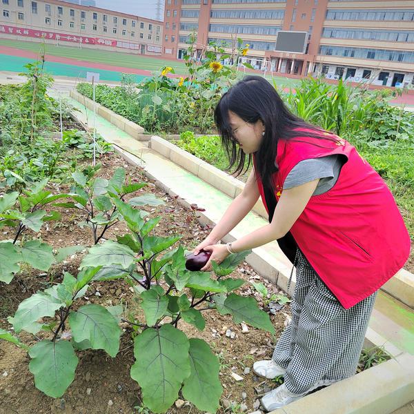 功夫不负有心人,6月中旬,劳动基地迎来大丰收。红彤彤的番茄、黄澄澄的玉米、紫莹莹的茄子缀满枝头,一派生机勃勃的丰收景象。党员老师们组织学生有序开展采摘活动,田间地头洋溢着欢声笑语。看着亲手培育的劳动成果,师生们脸上绽放出幸福与满足的笑容,深刻体会到“一分耕耘,一分收获”的真谛。