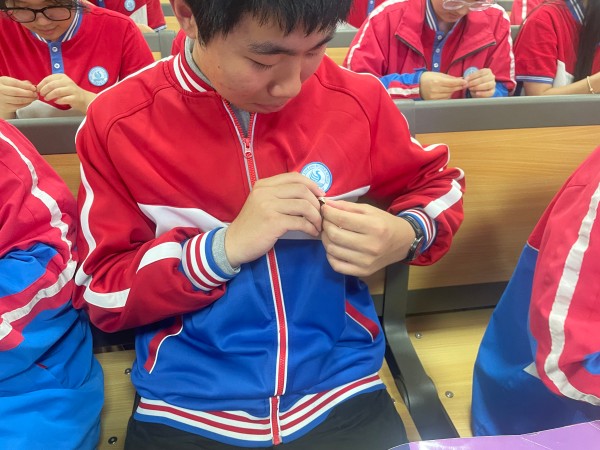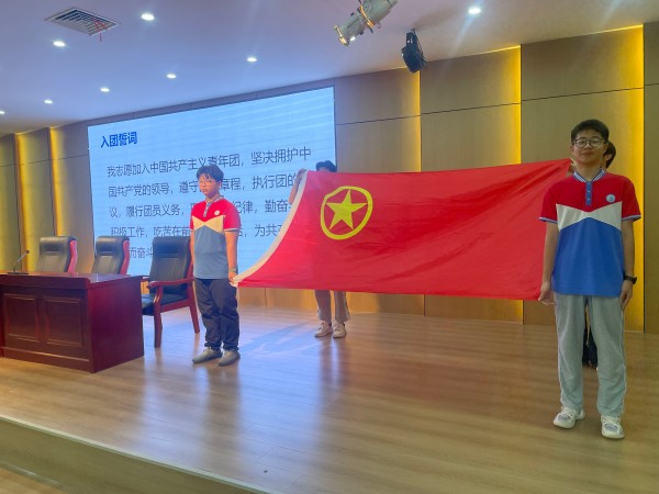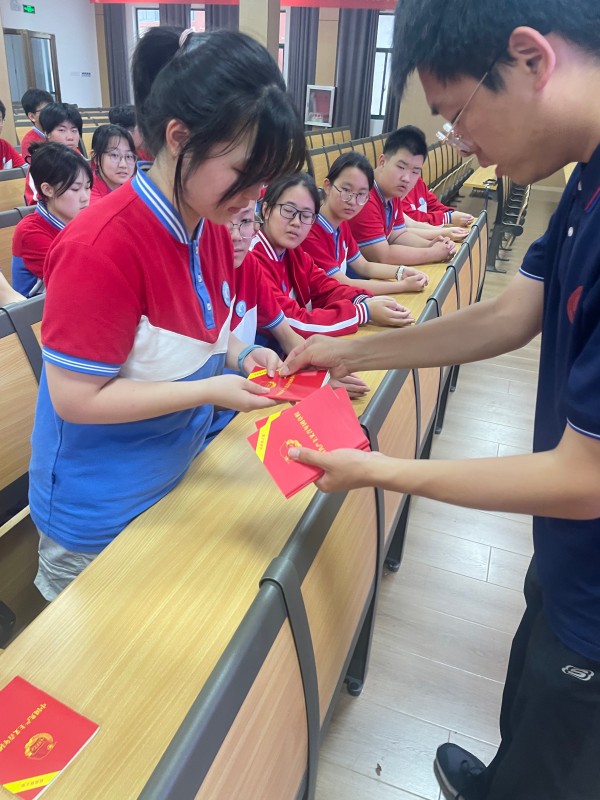 在激动人心的时刻,高中部团委副书记周骏老师为新团员代表颁发了象征光荣与责任的团徽。新团员们庄重地将闪耀的团徽佩戴在左胸前,这枚徽章不仅是共青团的标志,更是一份沉甸甸的使命,时刻提醒着他们要以更高的标准要求自己,在青春赛道上勇当先锋。