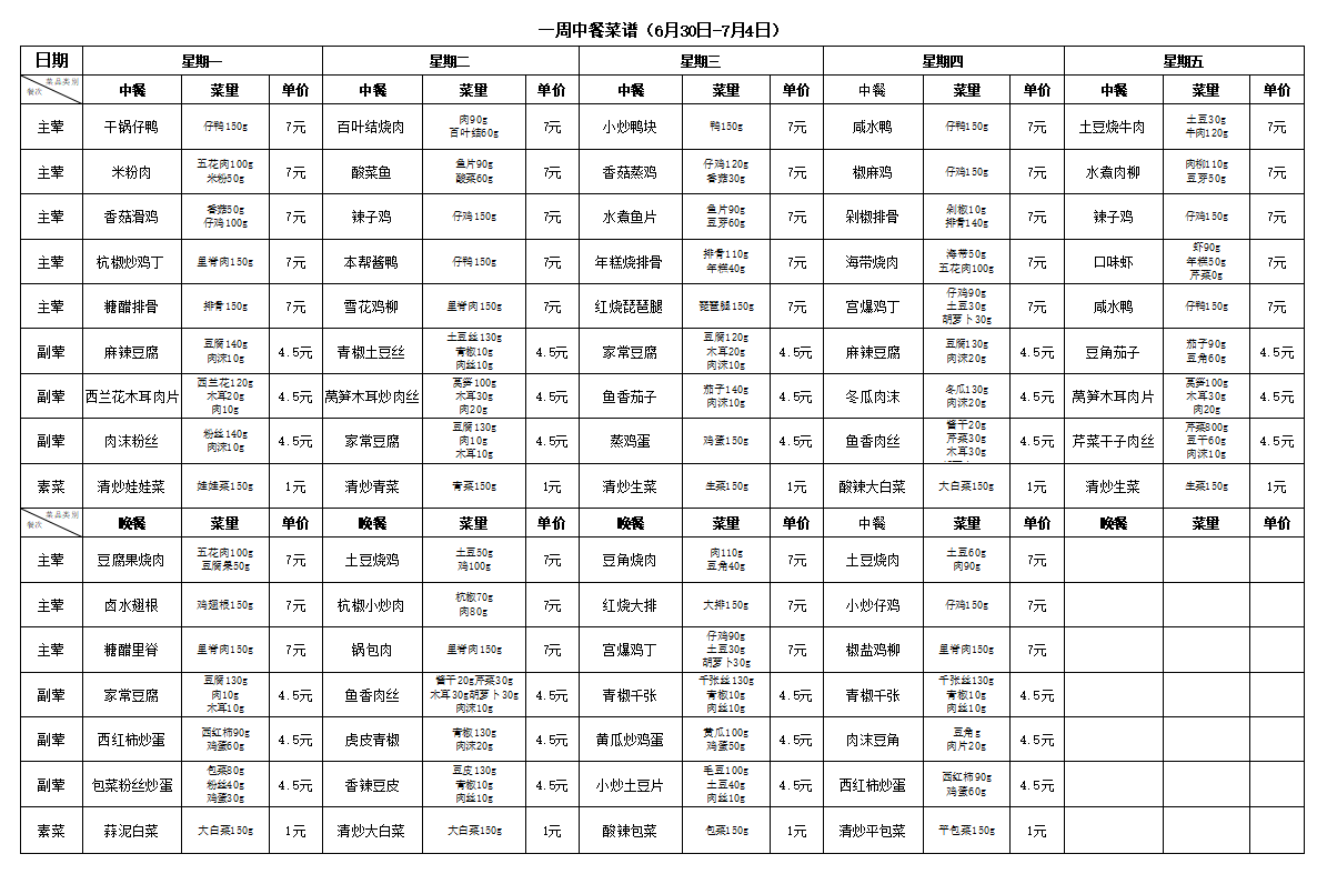 合肥新康中学食堂一周菜谱(6月30日-7月4日)