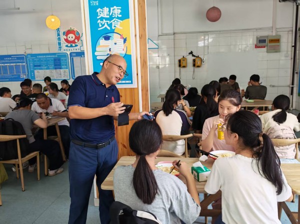时近正午,阳光澄澈,新生们陆续走进宽敞明亮的食堂。学校领导来到学生中间,与大家同桌就餐,亲切交谈,细致询问报到感受和饮食习惯。食堂不仅准备了营养均衡的午餐,还特别供应了清凉解渴的各式饮品,为稍褪暑意的午间增添了一份贴心与舒爽。