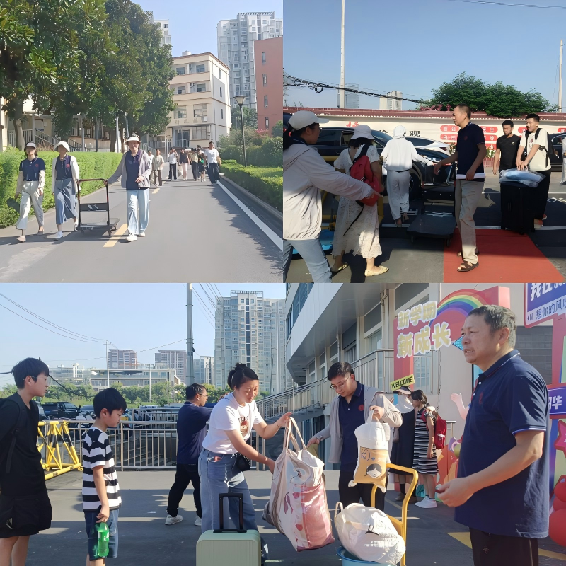 上午的校门口,报到流程清晰有序,老师们早早在报到区等候。看到新生们拖着沉甸甸的行李箱、背着鼓鼓的书包,老师们立刻主动上前帮忙,从校门口到宿舍楼下,一路接力搬运。途中,老师们还不时轻声叮嘱:“慢慢走,别着急,有需要随时说。”简单的举动与话语,既打消了家长对孩子独自报到的顾虑,也让新生刚踏入校园,就感受到了浓浓的暖意。