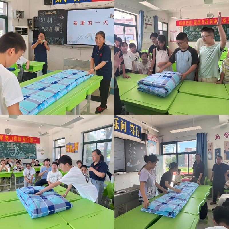 宿舍内,两场实用的“入学第一课”同步开展。生活老师到班内开展内务课堂,一步步细致演示被子的“豆腐块”叠法:铺平被面、对折压边、捏出棱角,每个步骤都讲解得清晰易懂;另一边,班主任结合宿舍生活实际,分享集体住宿小窍门:“物品分类摆放,宿舍才会整洁;休息时互相体谅,保持安静,大家才能住得舒心。”新生们一边学习,一边动手实践,不仅学会了基本的内务技能,更懂得了集体生活中的包容与协作。
