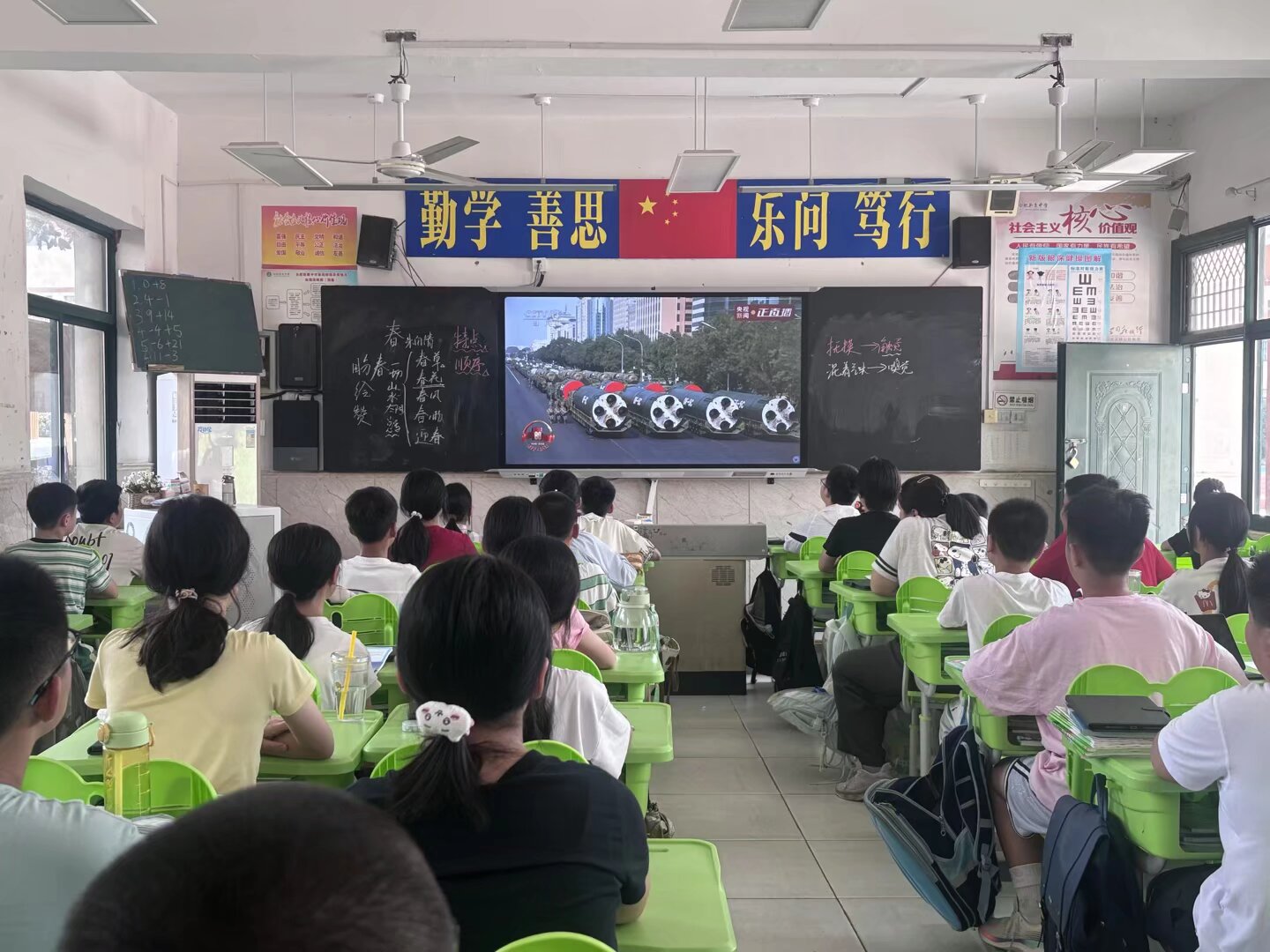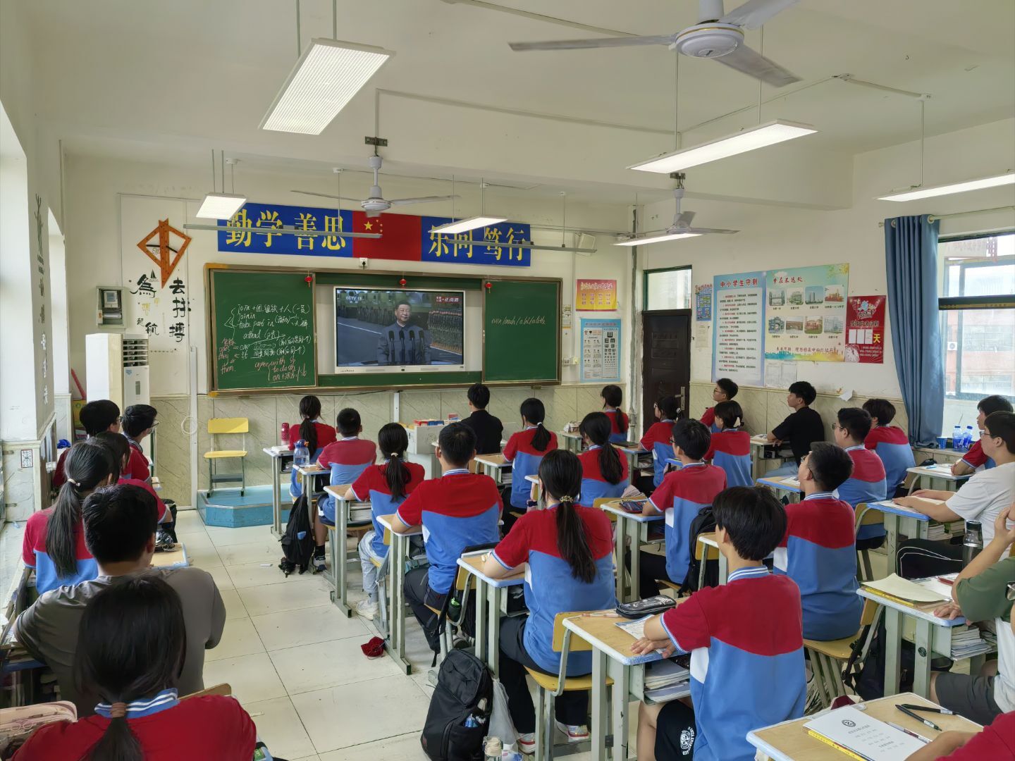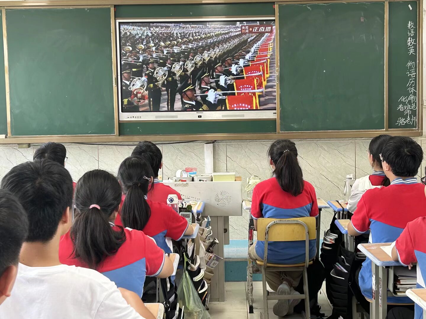 学校会议室里,教师们神情专注,大屏幕清晰地播放着阅兵的每一个精彩瞬间。在各个班级,学生们端正坐姿,眼睛紧紧盯着教室里的多媒体设备,仿佛置身于天安门广场,亲身感受着那份庄严与神圣。