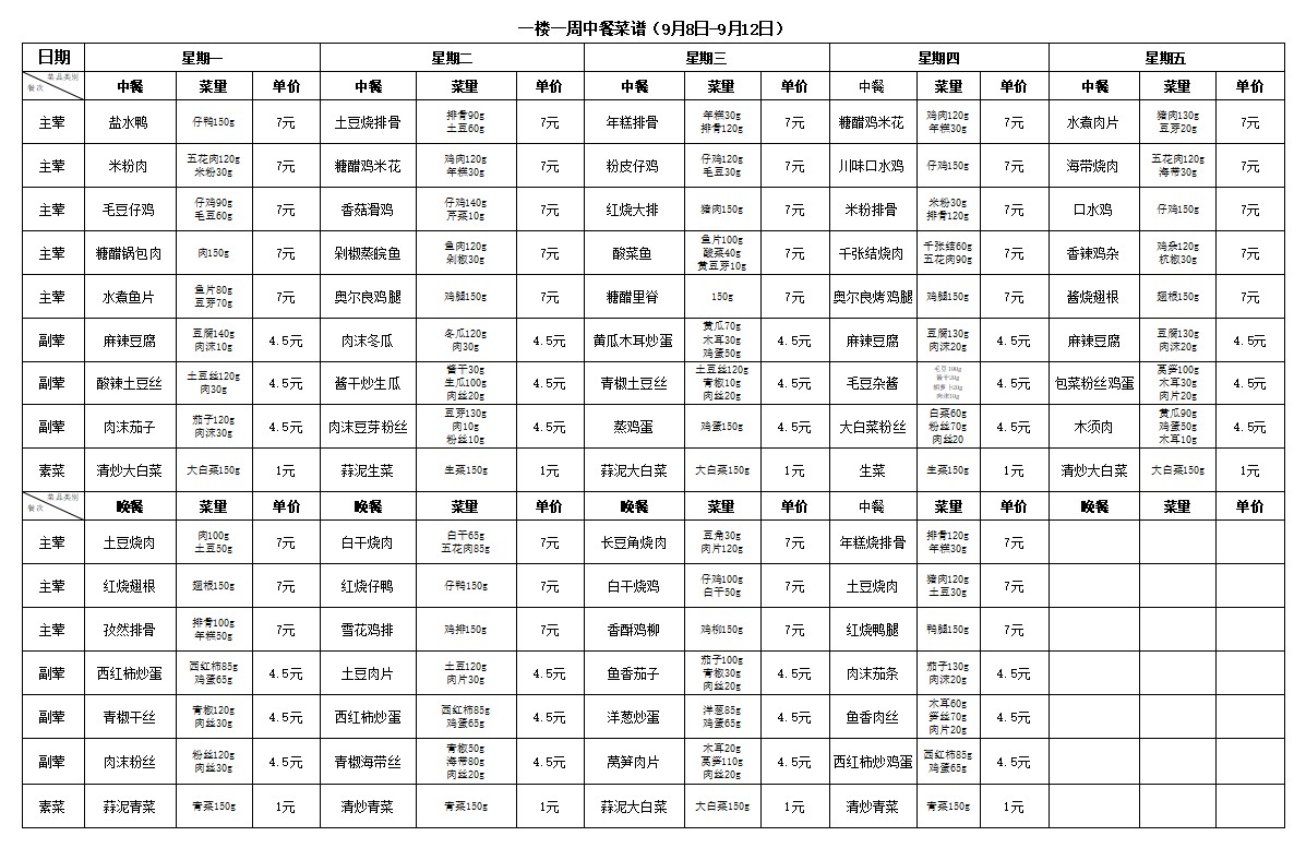 合肥新康中学食堂一周菜谱(9月8日-9月12日)