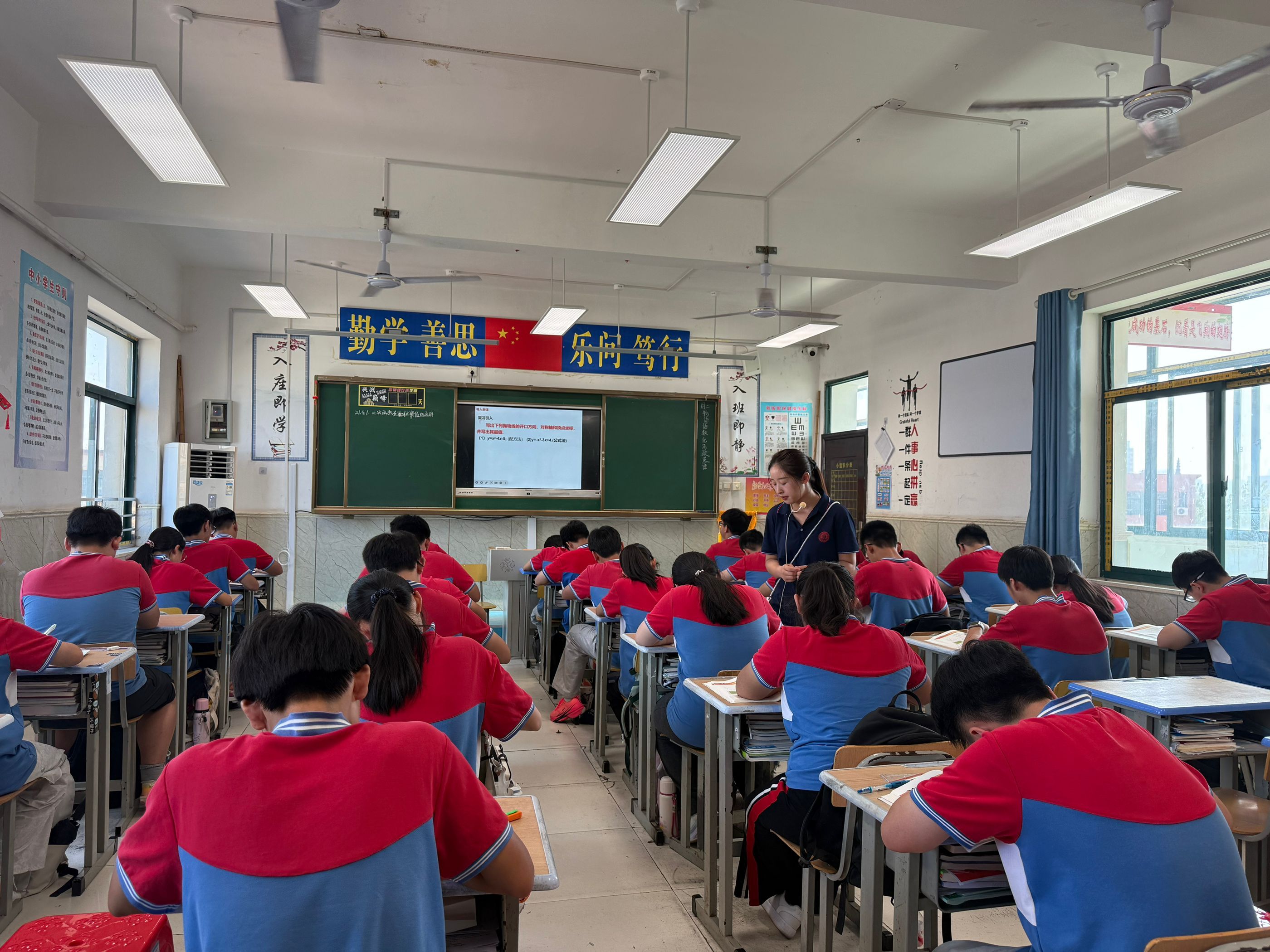 2025年9月16日上午,鲁文玲老师在九(3)班执教了一节以《二次函数解决实际问题》为主题的公开课,充分展现了扎实的教学功底与先进的教学理念。课堂以抛掷球类、围篱笆等生活情境引入,巧妙引导学生建立平面直角坐标系,将铅球飞行轨迹、菜园围栏面积等问题转化为二次函数模型,有效渗透数形结合思想。