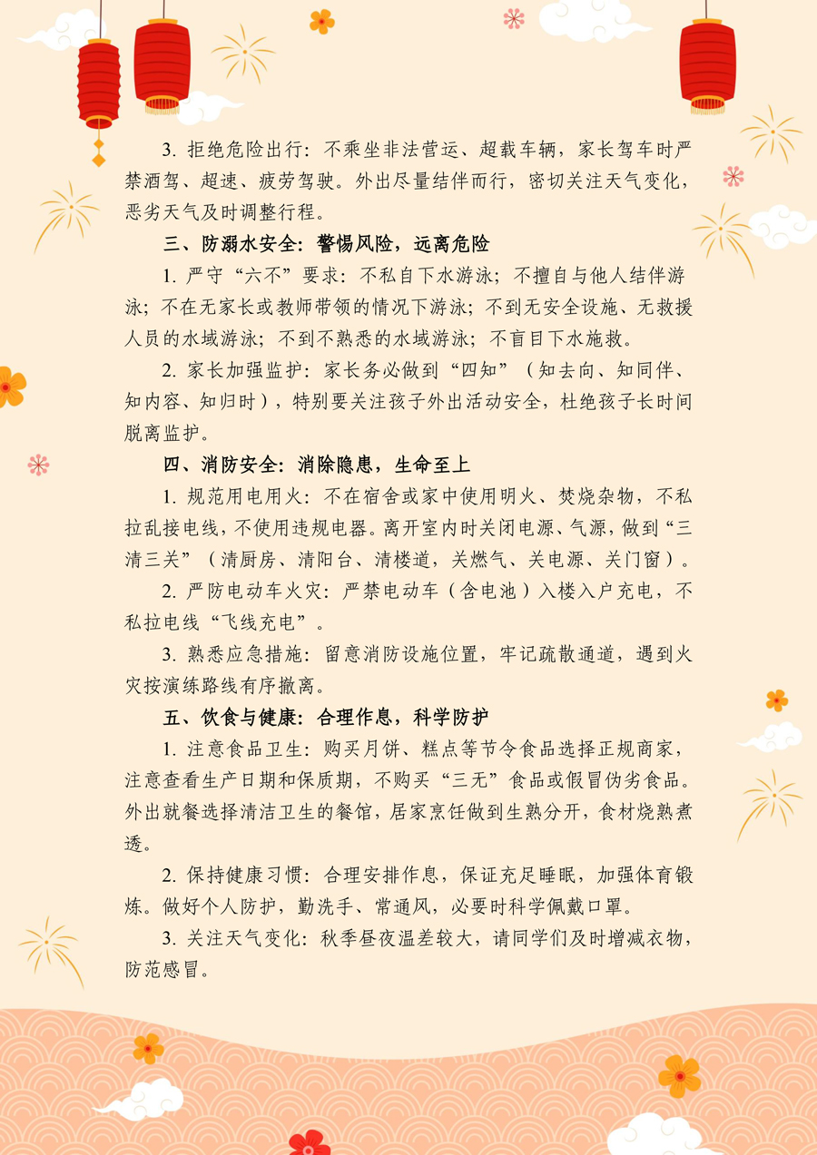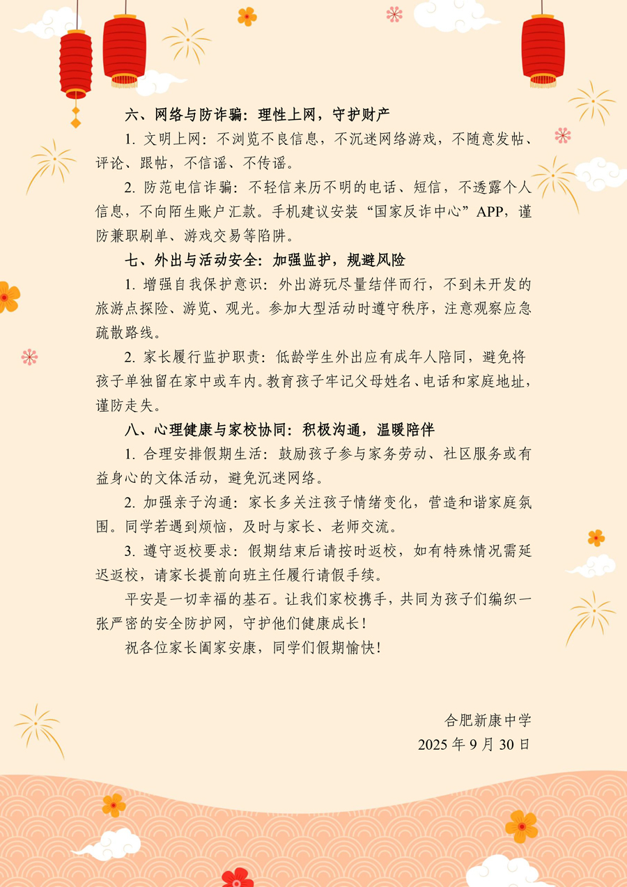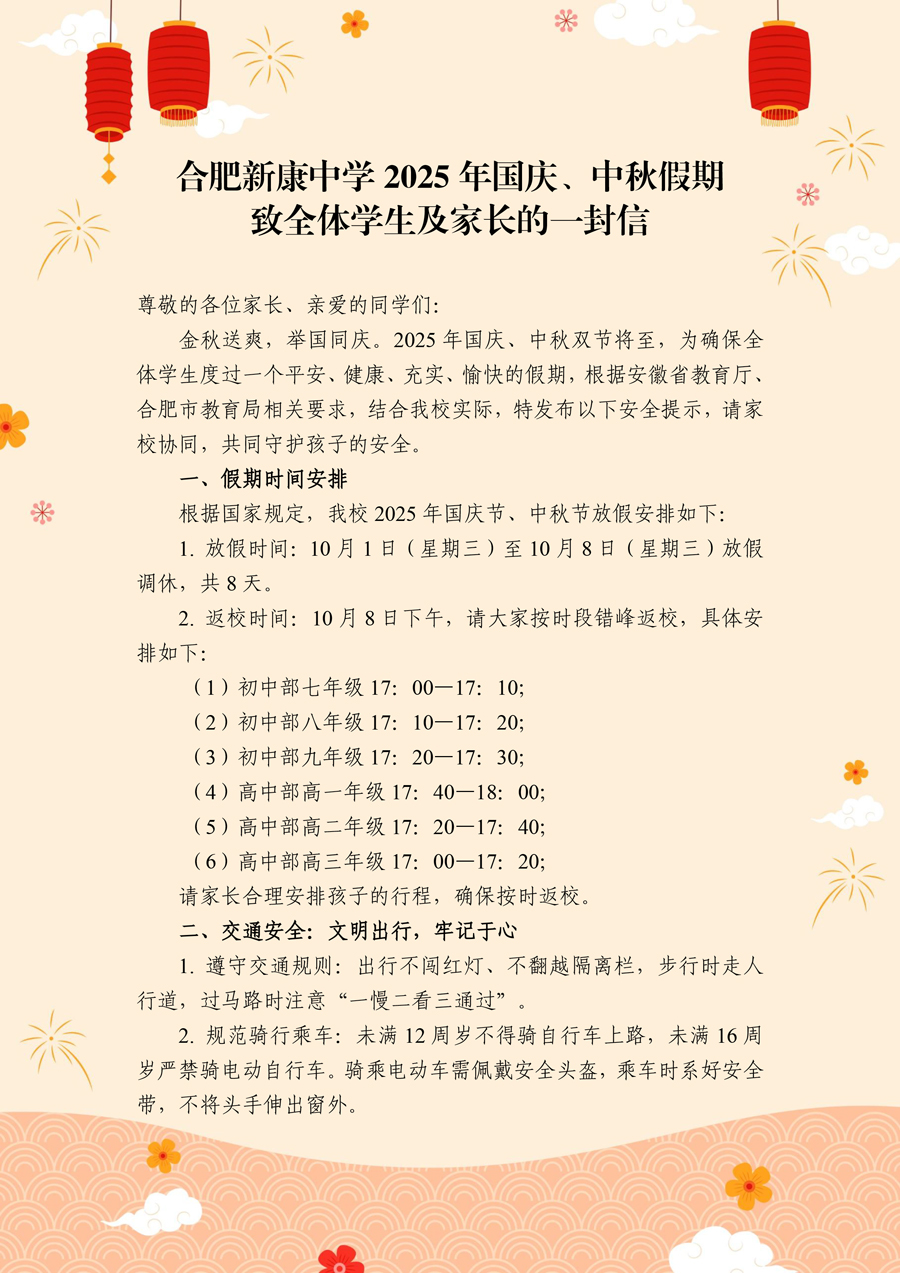 合肥新康中学2025年国庆中秋假期致全体学生及家长的一封信