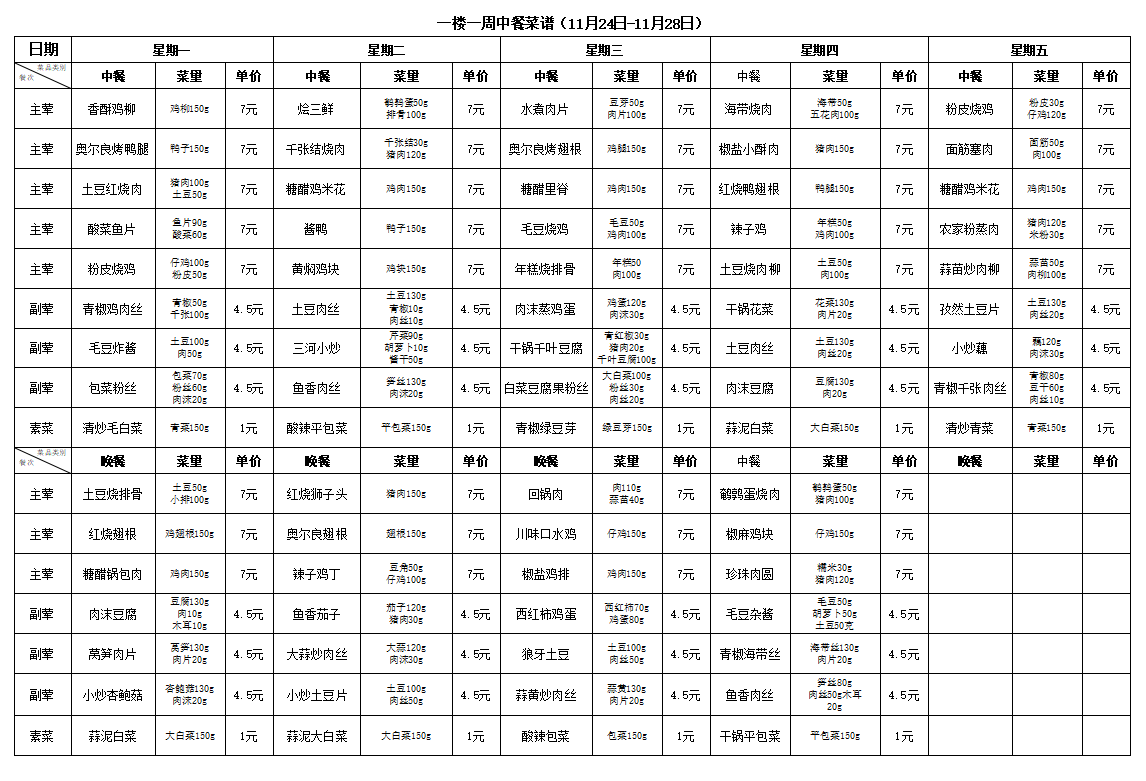 合肥新康中学食堂一周菜谱(11月24日-11月28日)