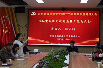 2025年11月19日,合肥新康中学党支部召开2025年第四季度党员大会,本次大会以“深学全会精神、严把党员发展关、谋划党建新篇”为核心,涵盖理论学习、预备党员转正、主题活动解读及总结讲话等关键议程,支部全体党员齐聚一堂,共促学校党建工作再上新台阶。