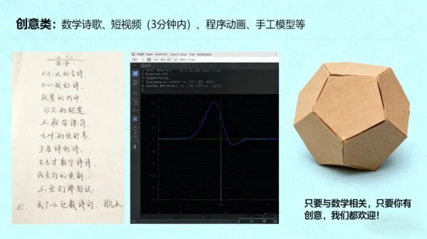 3.创意类:数学诗歌、短视频(3分钟内)、程序动画、手工模型等