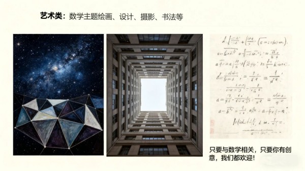 2.艺术类:数学主题绘画、设计、摄影、书法等