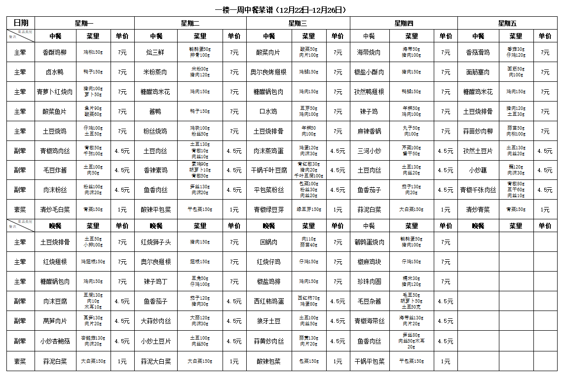 合肥新康中学食堂一周菜谱(12月22日-12月26日)