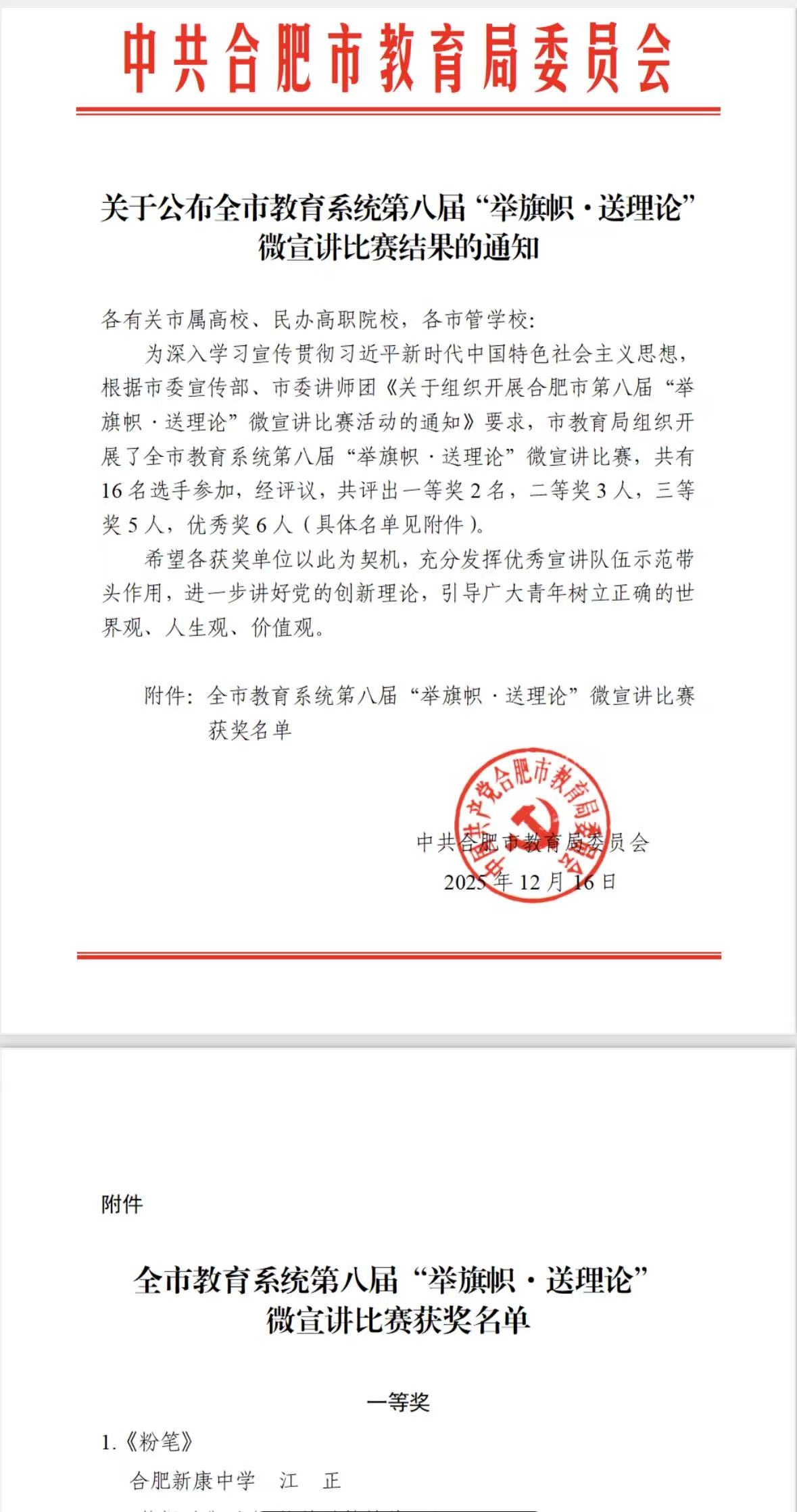 近日,合肥市第八届“举旗帜·送理论”微宣讲比赛决赛圆满落幕。经过激烈角逐,合肥新康中学江正老师凭借其深情而富有思辨的宣讲作品——《执一支粉笔,写时代华章》,在合肥市教育系统众多优秀选手中脱颖而出,荣获一等奖。