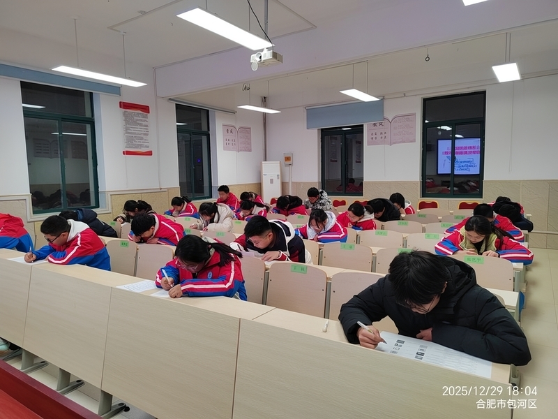 本次校内初赛严格遵循包河区大赛章程,采用闭卷笔试形式,试题设计紧扣初中英语课程标准核心要求,既涵盖教材重点核心词汇,题型又丰富多样且难易梯度合理,全方位、多层次考查学生的词汇积累量与灵活运用能力。比赛现场,选手们坐姿端正、全神贯注,工整的字迹在试卷上留下清晰印记;监考教师们认真履职、严谨监考,全程保持考场秩序井然,以公平、公正的态度保障了赛事的顺利开展。