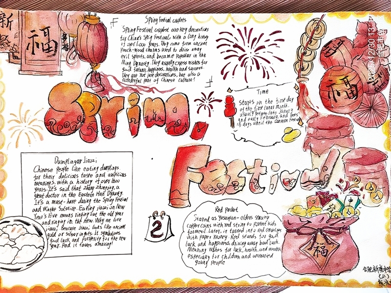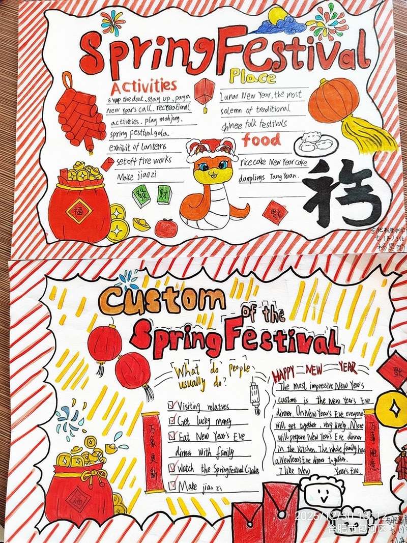 本次活动以“美育润心,英语传情”为主题,学生围绕外研版七年级上册 Unit 1、4、5 单元 “Presenting ideas” 板块创作,严格遵循原创手工原则,鼓励学生将英语语言学习与艺术创作相结合。活动得到了师生热烈响应,七年级学生围绕中国传统节日、特色文化等题材,精心设计版面,巧妙融入英文名言、创意插画与色彩搭配,既展现了扎实的英语表达能力,又体现了良好的艺术素养和创新思维。