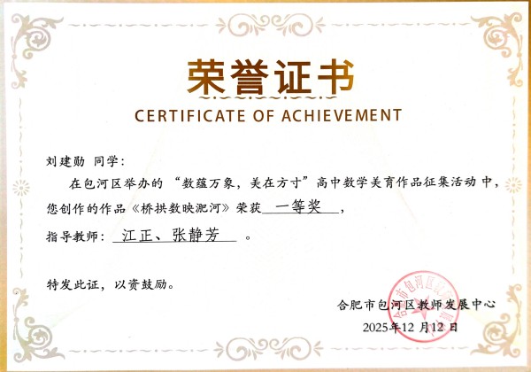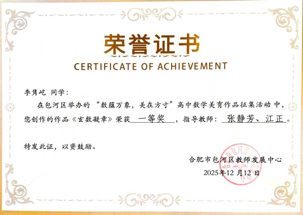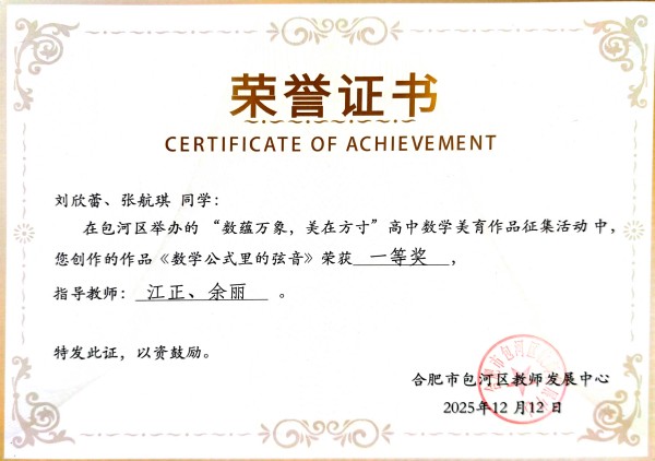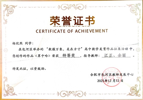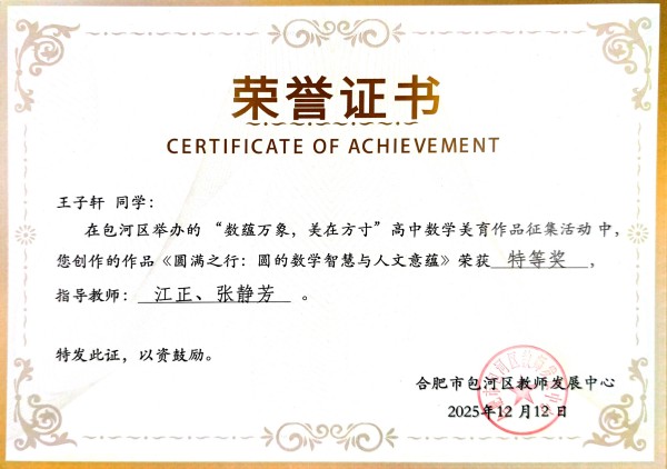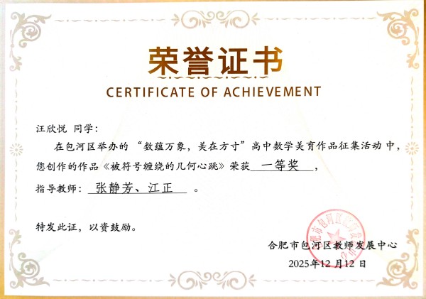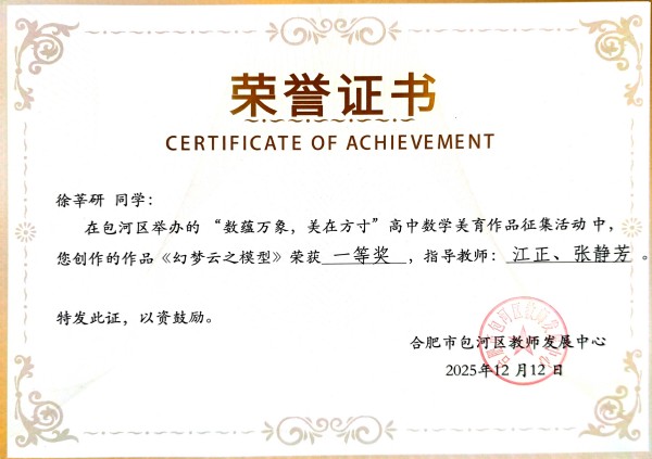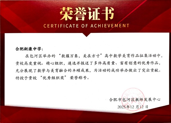 近日,由包河区举办的“数蕴万象 美在方寸”高中数学美育作品征集活动评选结果揭晓。合肥新康中学学子凭借出色的艺术感知与数学素养,在众多参赛作品中脱颖而出,共斩获特等奖4项、一等奖5项、二等奖21项,成绩斐然,展现出学校在学科融合与美育实践中的深厚底蕴。