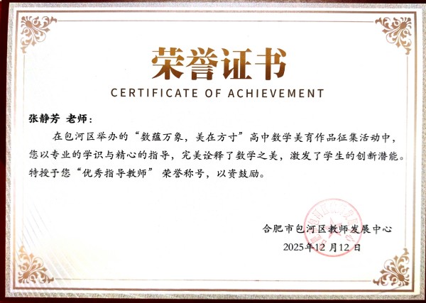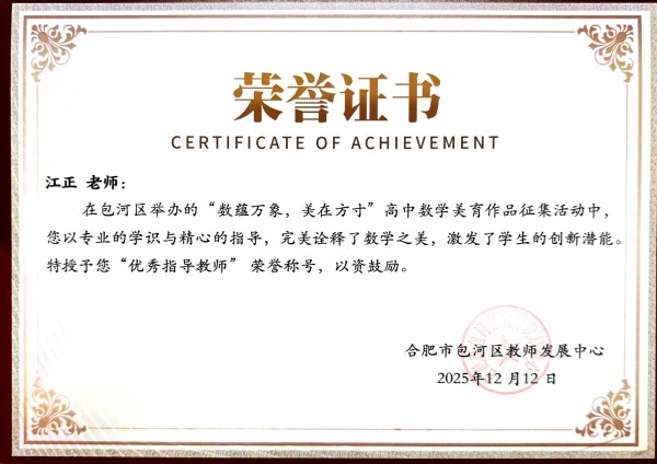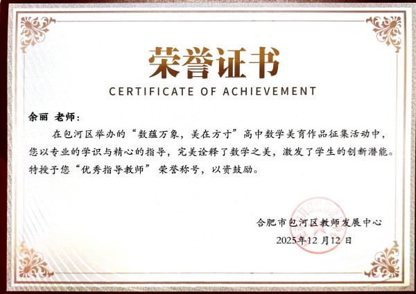 同时,我校江正、张静芳、余丽三位老师荣获“优秀指导老师”称号。他们以专业的指导、用心的陪伴,引领学生发现数学之美、创造艺术之趣,是学生成长路上重要的引路人。此外,我校因组织有力、作品质量突出,被授予“优秀组织奖”。