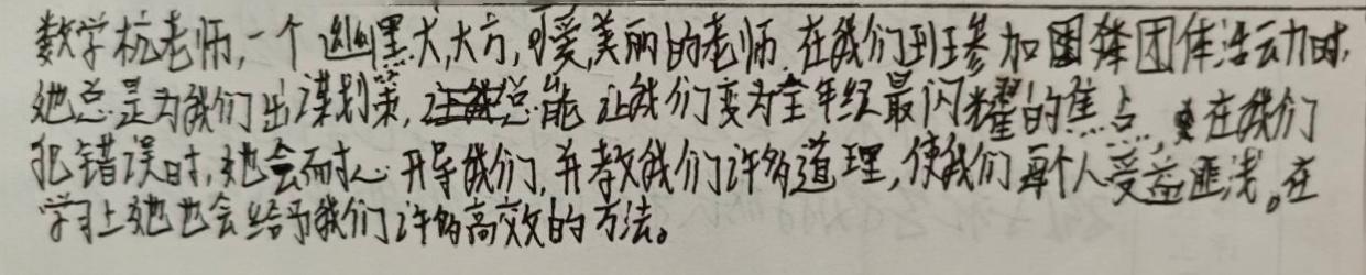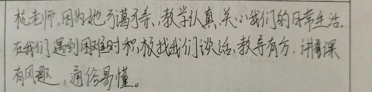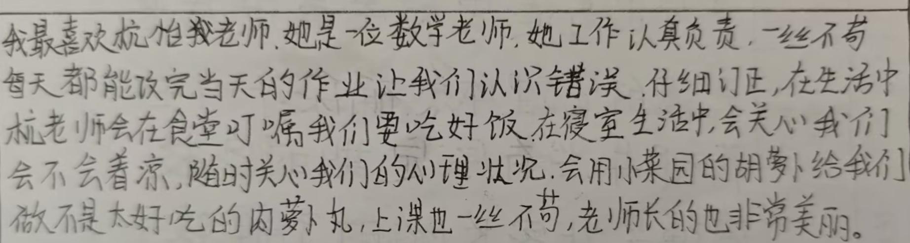 我最喜欢杭怡我老师,她是一位数学老师,她工作认真负责,一丝不苟。每天都能改完当天的作业,让我们认识错误、仔细订正。在生活中,杭老师会在食堂叮嘱我们要吃好饭,在寝室生活中会关心我们会不会着凉,随时关心我们的心理状况,会用小菜园的胡萝卜给我们做不是太好吃的肉萝卜丸,上课也一丝不苟,老师长得也非常美丽。