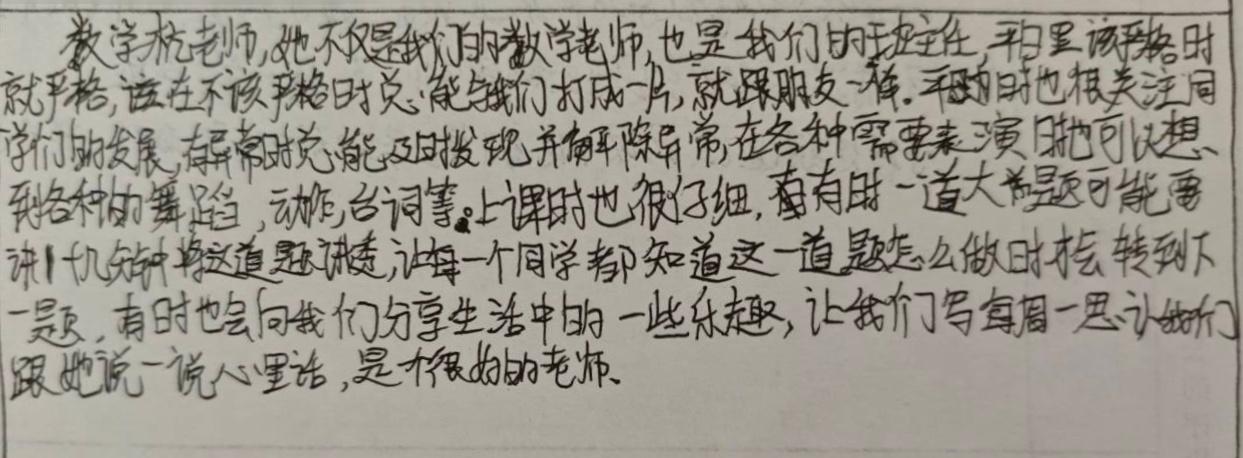 数学杭老师,她不仅是我们的数学老师,也是我们的班主任,平日里该严格时就严格,不该严格时总能与我们打成一片,就跟朋友一样。平时也很关注同学们的发展,常常能及时发现并解除异常,在各种需要表演时也可以想到各种的舞蹈、动作、台词等。上课时也很仔细,有时一道大题可能要讲十几分钟将这道题讲透,让每一个同学都知道这一道题怎么做时才会转到下一题,有时也会向我们分享生活中的一些乐趣,让我们写每周一思,让我们跟她说一说心里话,是个很好的老师。