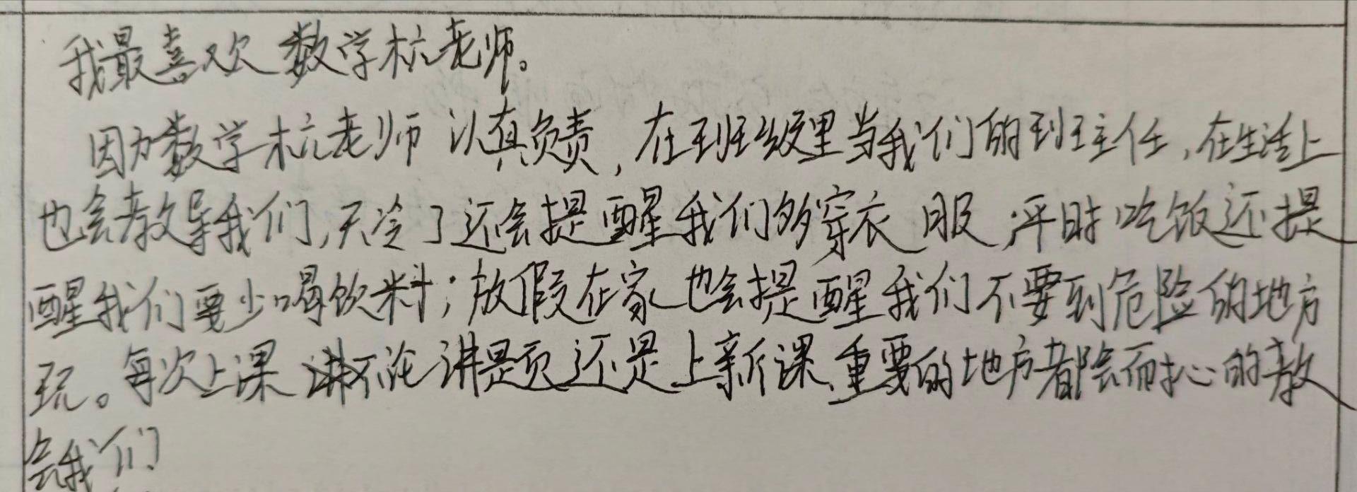 我最喜欢数学杭老师。因为数学杭老师认真负责,在班级里当我们的班主任,在生活上也会教导我们,天冷了还会提醒我们多穿衣服;平时吃饭还提醒我们要少喝饮料;放假在家也会提醒我们不要到危险的地方玩。每次上课,不论讲题还是上新课,重要的地方都会耐心地教我们。