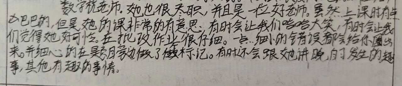 数学杭老师,她也很尽职,并且是一位好老师。虽然上课有时凶巴巴的,但是她的课非常的有意思,有时会让我们哈哈大笑,有时会让我们觉得她很可爱。批改作业很仔细,一点细小的错误都会给你圈出来,并细心地在题目旁做了标记。有时会跟她讲晚自习发生的趣事,其他有趣的事情。