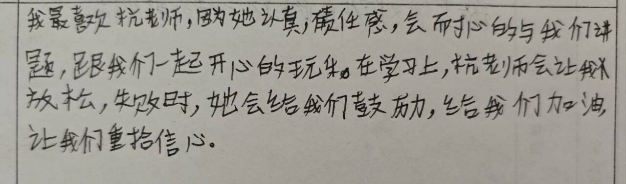 我最喜欢杭老师,因为她认真,有责任感,会耐心地与我们讲题,跟我们一起开心的玩乐。在学习上,杭老师会让我们放松,失败时,她会给我们鼓励,给我们加油,让我们重拾信心。