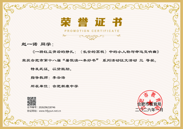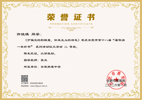 最是书香能致远,腹有诗书气自华。近日,合肥市第十八届中小学“暑假读一本好书”征文活动评选结果正式揭晓。合肥新康中学学子在此次活动中表现优异,载誉而归,共斩获9个奖项,其中一等奖2人,二等奖1人,三等奖6人,充分展现了新康学子深厚的阅读积淀与文学创作才华。
