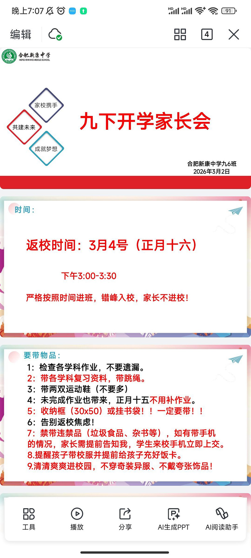 为切实保障学生身心健康,确保新学期开学平稳有序,3月2日晚,我校初中部开展七、八、九年级2025-2026学年第二学期线上家长会。